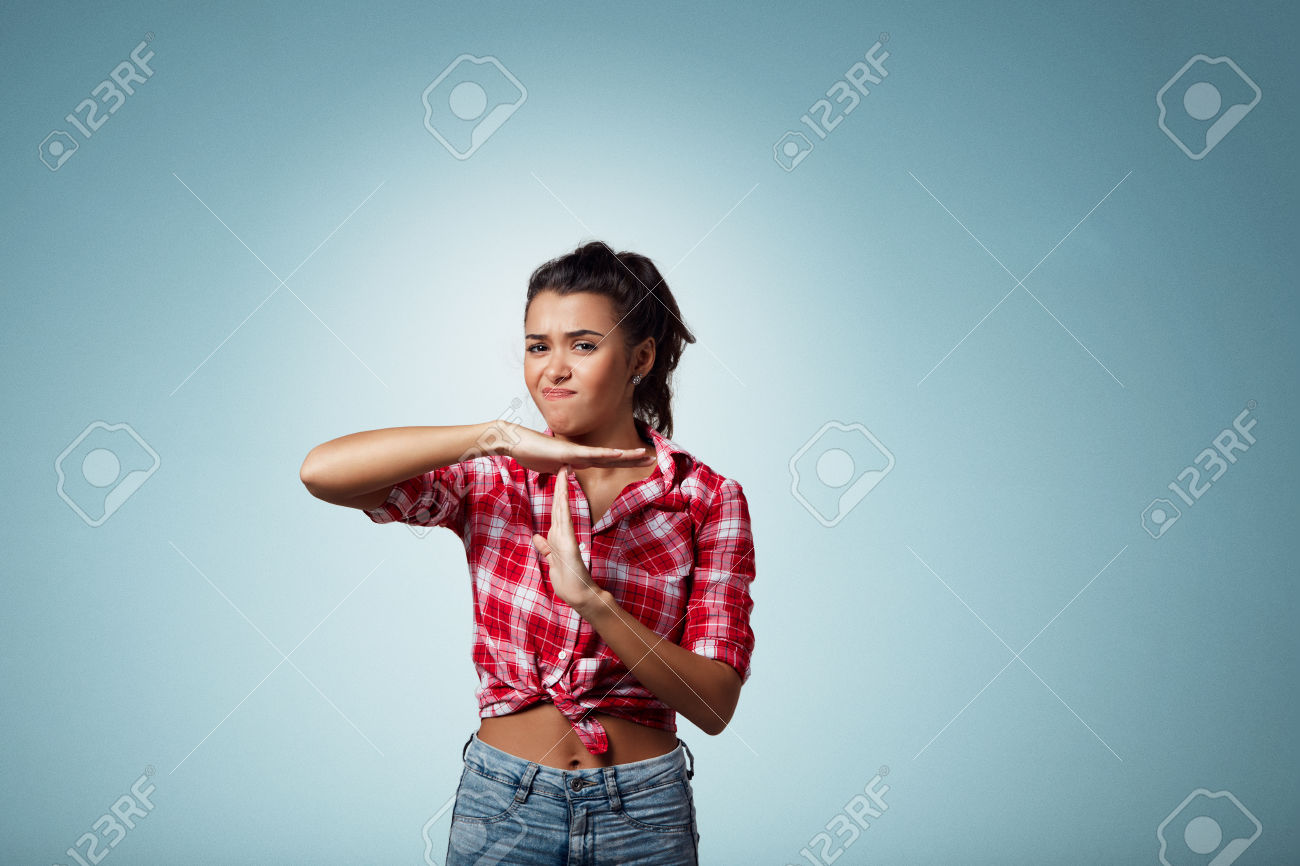 Closeup portrait of attractive young serious woman showing time out gesture with hands, isolated on blue background. Negative human emotion facial expression sign symbols,body language attitude.